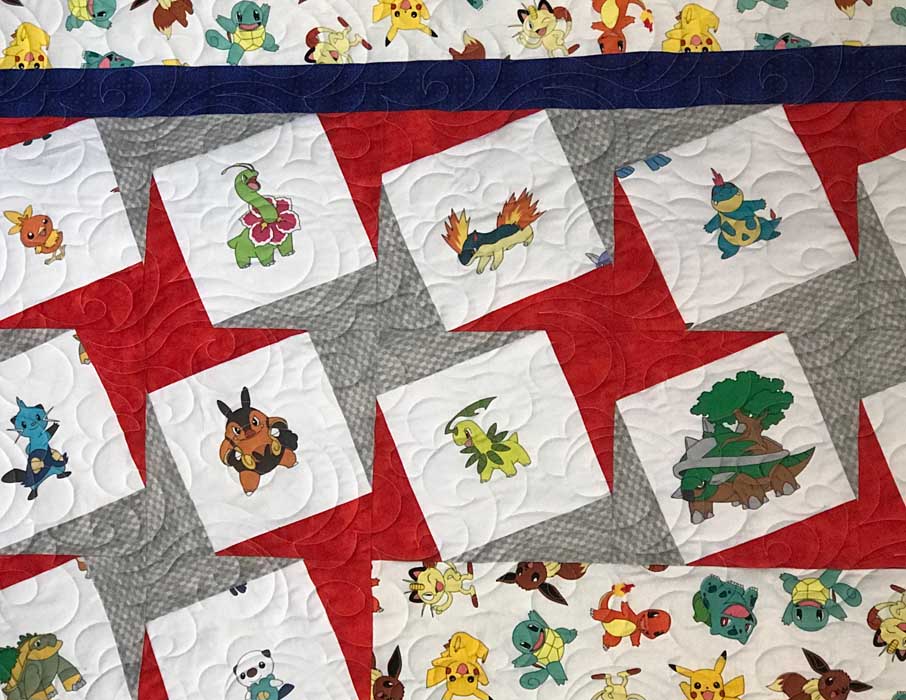 Storm Clouds Edge-to-Edge. The Pokemon figures evoke speed and movement, and we thought Storm Clouds complemented them perfectly. Moreover, since the pattern is not too dense, the Pokemon figures show through while the quilting disappears into the background.