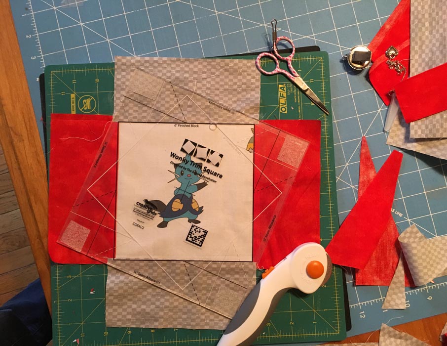 The Wonky stars are very easy to make! You can feature any fabric in the 6.5" center square. Then you add 3.5" x 6.5" rectangles to each side, and use the Wonky square to trim the block up. By carefully selecting the colors of the rectangles, you can create stars of different colors to make a pattern.