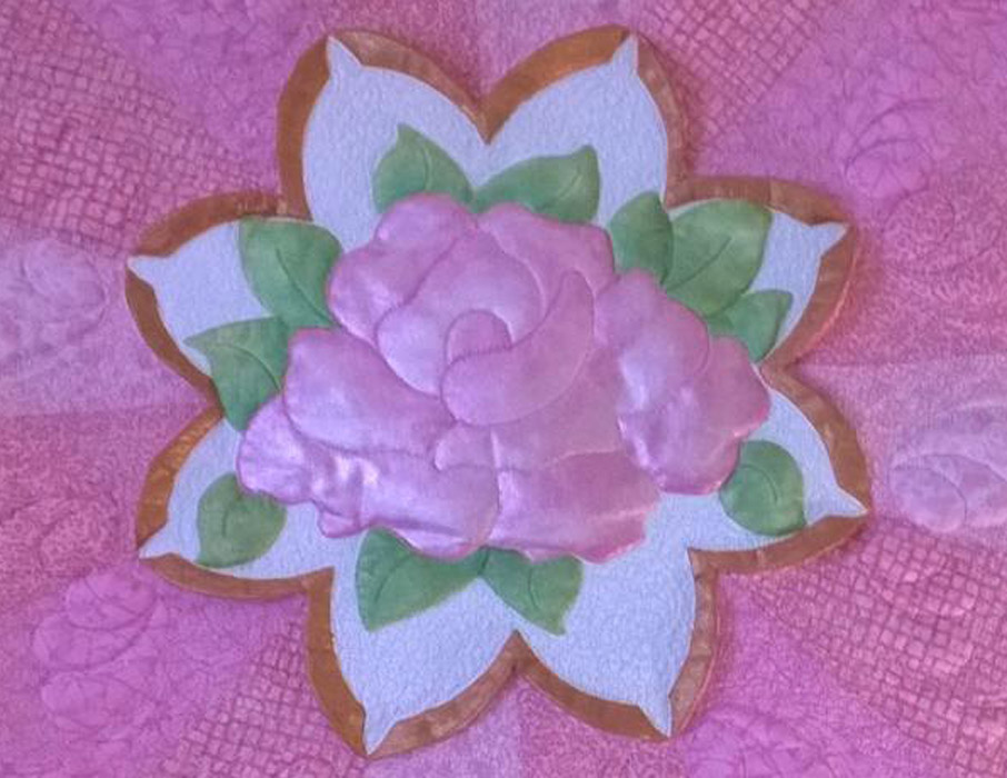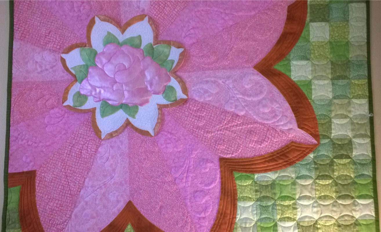 Using a Gammill machine with a Statler Stitcher, I chose the design that I wanted for each pink blade. I had to modify a design that I owner so that it would fit into the area. After the design was sewn in each pink section I micro-stippled around each design. I then used a white thread and micro-stippled around the open white area in the original rose section. The green squares stitched quickly with a point to point curve. I added the binding while the quilt was still on the machine, and finished it by hand when I was done.